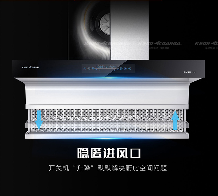 科恩智能體感操控煙機7510煙機擁有18.5m3/min大吸力,不讓油煙有任何逃竄之地,即便是爆炒辣椒也能做到不嗆鼻,真正展現了吸煙實力派!另外,這款煙機最大亮點在于智能“升降”功能,打破了傳統煙機設計理念,現代化開關機自動“升降”,有效解決了廚房空間問題。
