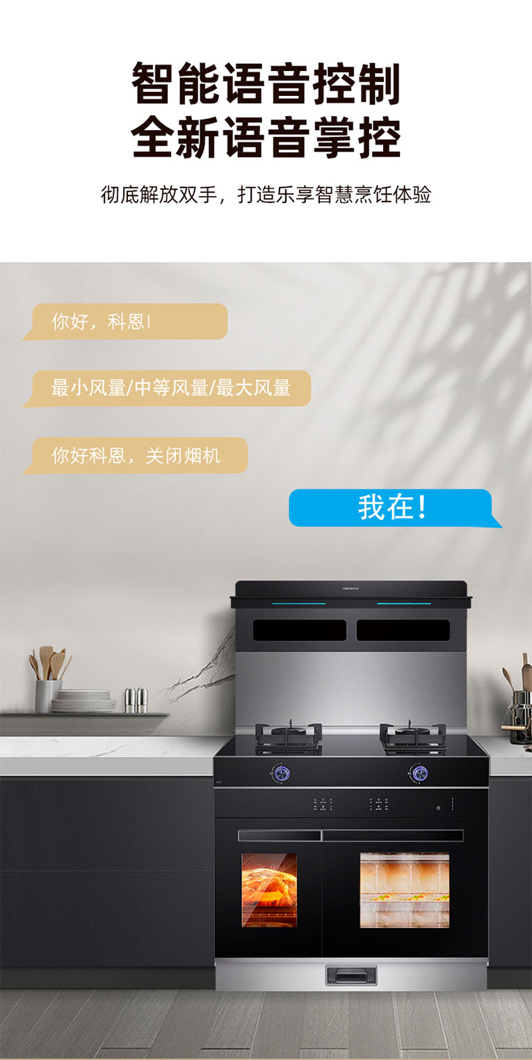 另外,集成灶十大品牌、廚電行業(yè)十大品牌科恩S450左右蒸烤集成灶還擁有智能語音控制,“你好科恩!最小風(fēng)量/最大風(fēng)量/最大風(fēng)量;你好科恩!關(guān)閉煙機(jī)”,全新語音掌控徹底解放雙手。智能變頻巡航20m3/min低空近吸,低空封鎖油煙升騰區(qū),吸凈雙灶爆炒煙,杜絕油煙倒灌,遇堵排煙強(qiáng)效節(jié)能,高樓排煙快!在火力方面,擁有穩(wěn)定而暢快的火力是非常好的烹飪體驗(yàn),小火煲湯、大火爆炒,烹飪出舌尖上不同的美味,科恩S450左右蒸烤集成灶具備5.2kW猛火爆炒,聚能火力加持,火焰更集中,大火小火皆在掌控之間,煎炸蒸炒毫無壓力。