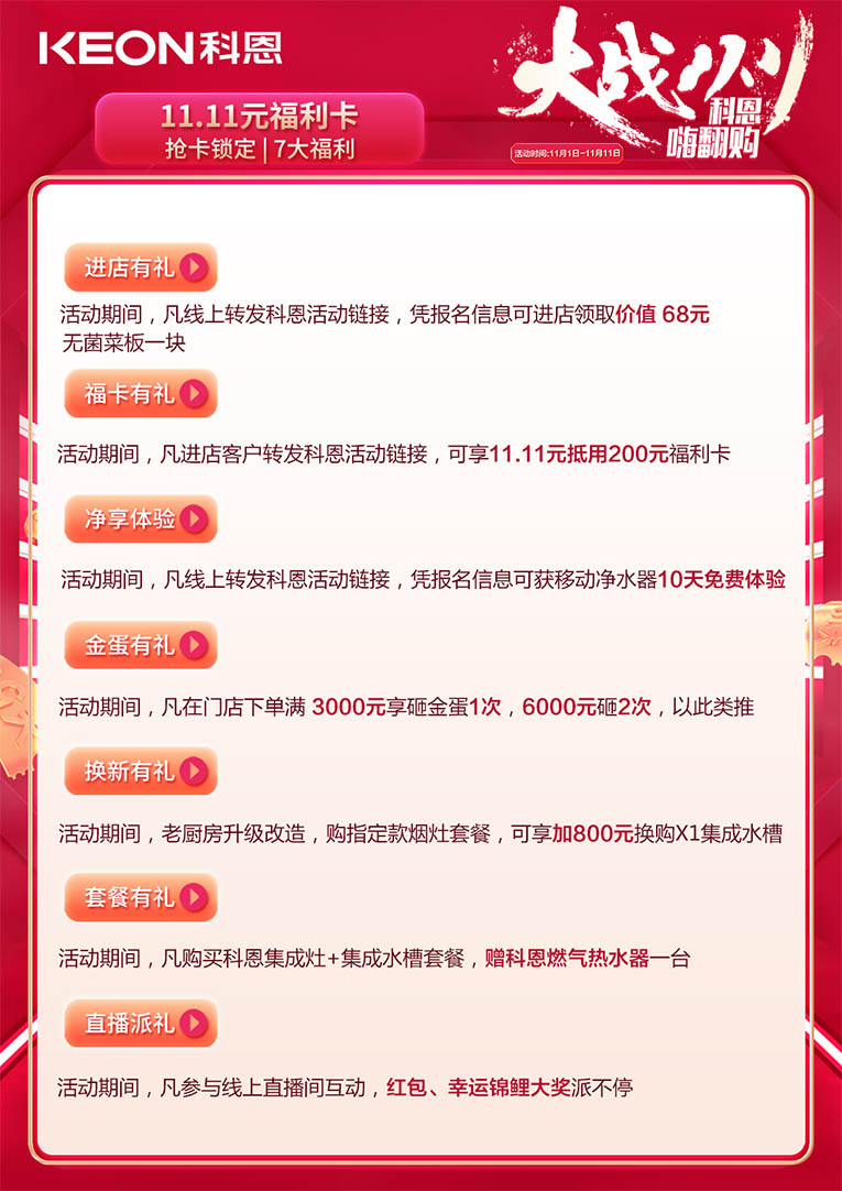 大戰雙11,科恩嗨翻購,11月1日——11月11日活動期間,前往科恩全國門店提前搶購11.11元福利卡,就能提前鎖定7大福利。進店有禮:活動期間,凡線上轉發科恩活動鏈接,憑報名信息可進店領取價值68元無菌菜板一塊;??ㄓ卸Y:活動期間,凡進店客戶轉發科恩活動鏈接,可享11.11元抵用200元福利卡;凈享體驗:活動期間,凡線上轉發科恩活動鏈接,憑報名信息可獲移動凈水器10天免費體驗;金蛋有禮:活動期間,凡在門店下單滿3000元享砸金蛋1次,6000元砸2次,以此類推;換新有禮:活動期間,老廚房升級改造,購指定款煙灶套餐,可享加800元換購X1集成水槽;套餐有禮:活動期間,凡購買科恩集成灶+集成水槽套餐,贈科恩燃氣熱水器一套;直播派禮:活動期間,凡參與線上直播間互動,紅包、幸運錦鯉大獎派不停。