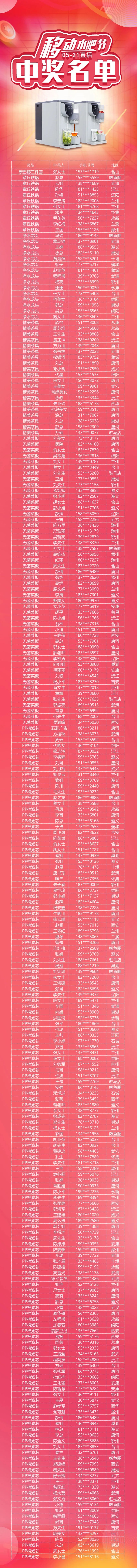 什么?聽說科恩移動水吧節不僅能15天免費體驗一臺頂九臺的集成式凈水器,還能參與直播抽獎,而且還是100%中獎,科恩電器也太壕氣了吧!!!科恩移動水吧節,誓讓國人喝好水,全國免費體驗活動正在火熱進行中,重磅政策與誠意豪禮,免費體驗,產品始終如一。為回饋消費者,科恩移動水吧節直播抽獎活動順利舉行,凡參與免費體驗活動即可抽取獎品,實力寵粉,100%中獎!抽獎名單公示如下: