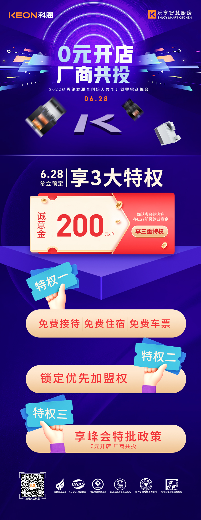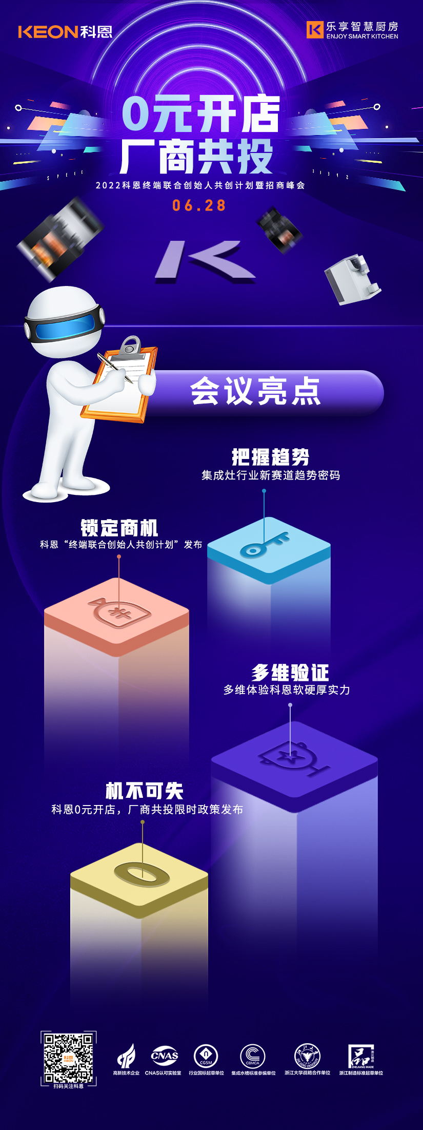 6月28日2022科恩終端聯(lián)合創(chuàng)始人共創(chuàng)計劃暨招商峰會將在廚具之都嵊州隆重舉辦,本次峰會將以“0元開店,廠商共投”為主題,邀請來自全國各地的行業(yè)精英、投資大佬匯聚一堂,共同探討廚電行業(yè)發(fā)展趨勢,解鎖集成灶行業(yè)新賽道趨勢密碼,多維驗證科恩集團軟硬厚實力,屆時,將為各位來賓解讀限時政策內(nèi)容,為各位投資人提供一個潛力無限,共創(chuàng)霸業(yè)的優(yōu)秀共創(chuàng)平臺。