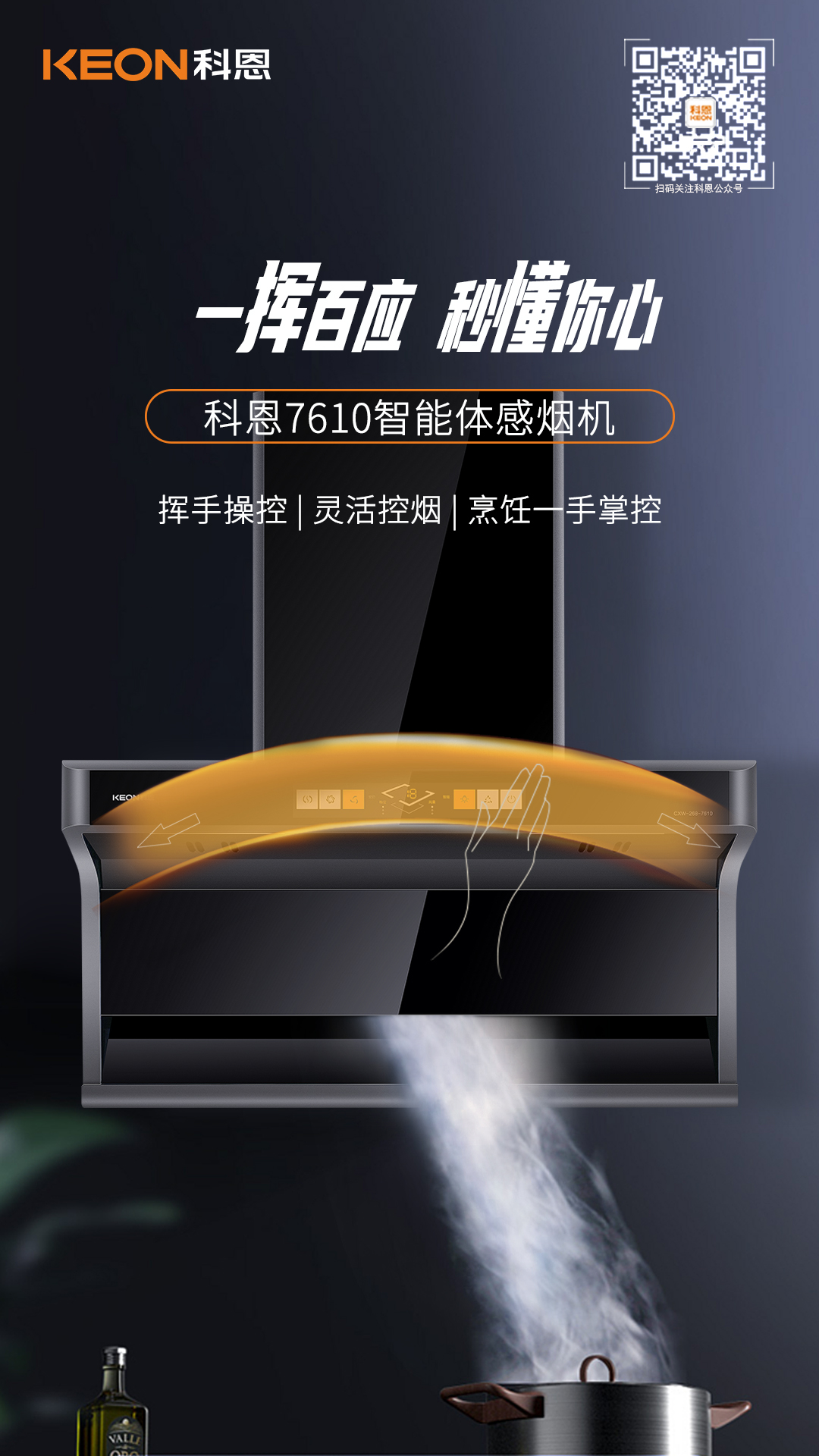 萬家燈火不及小家煙火,一家三口,一日三餐,可別讓油煙壞了好心情!科恩新款頂側雙吸平板煙機7610想你所想,讓人間煙火變得清爽溫暖!