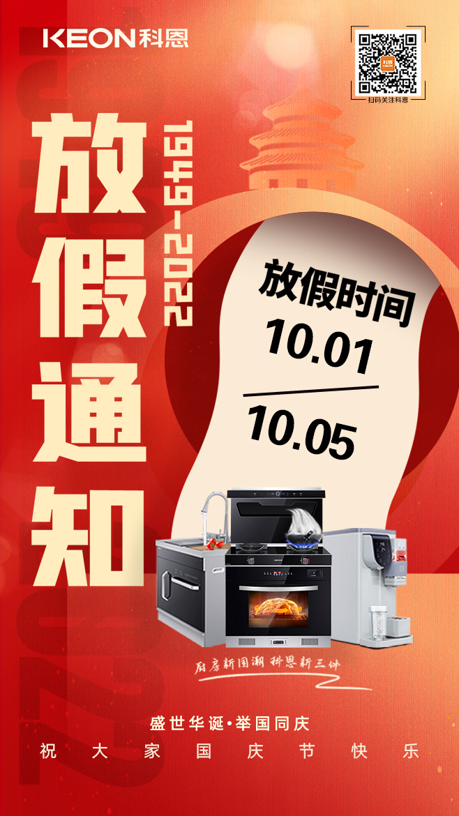 歡度國慶,共襄盛舉!科恩集成灶放假通知!