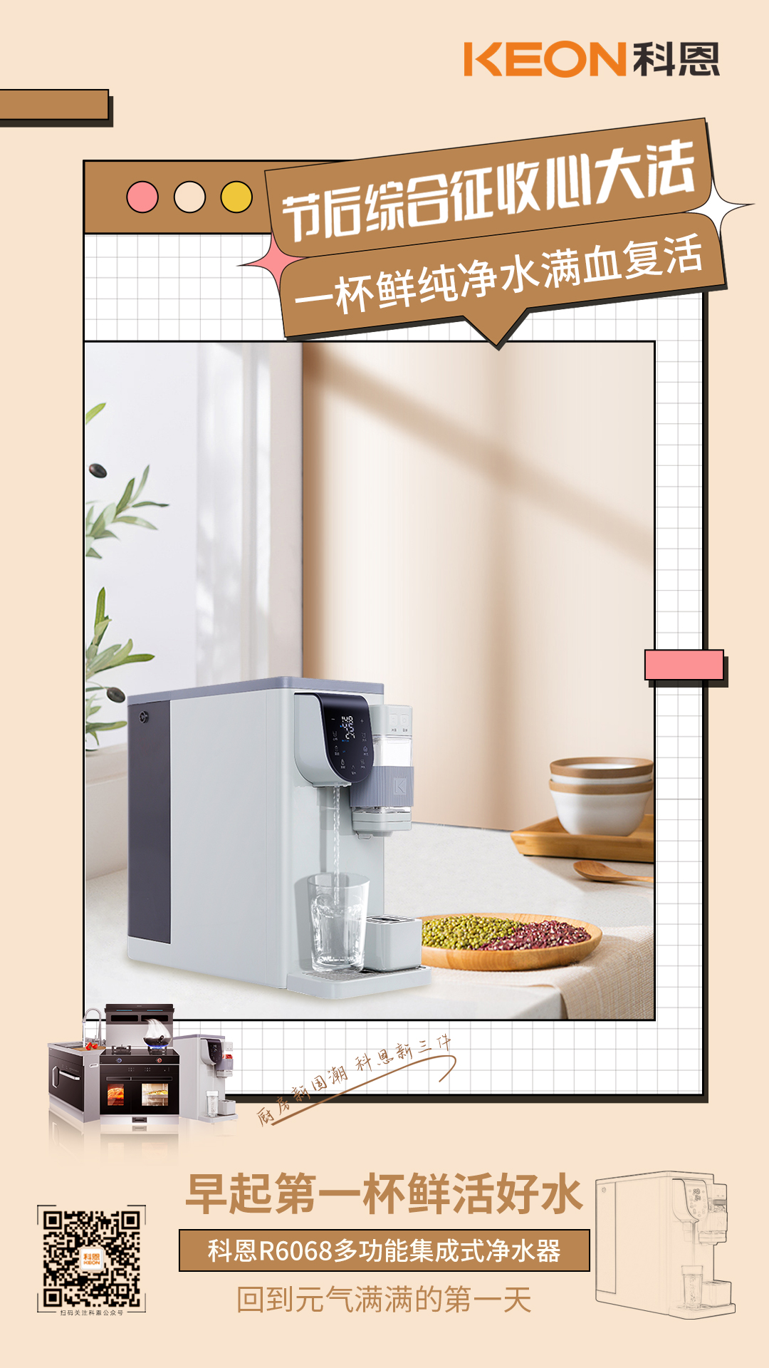 國慶長(zhǎng)假,熬夜晚起定時(shí)常態(tài),你需要一杯鮮活好水,煥新身體細(xì)胞,回到元?dú)鉂M滿的第一天!科恩R6068多功能集成式凈水器,一鍵適配不同飲水需求,溫度水量皆可調(diào)控,百變泡飲,滴滴鮮醇,RO精濾,UV殺菌,精濾至微,暢飲無憂,健康隨行!
