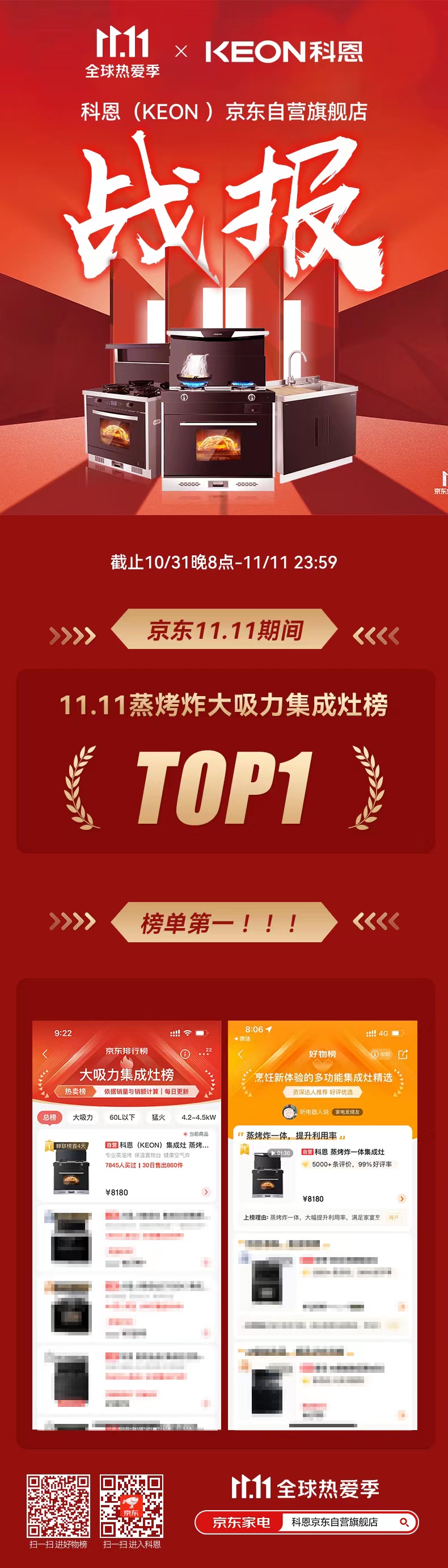 雙11全民狂歡盛宴完美落幕,科恩集成灶雙11終極戰報來襲,科恩集成灶火力全開,斬獲雙料第一:蒸烤炸大吸力集成灶榜TOP1,烹飪新體驗多功能集成灶TOP1,強大品牌號召力毋庸置疑,科恩速度,實力盡顯!
