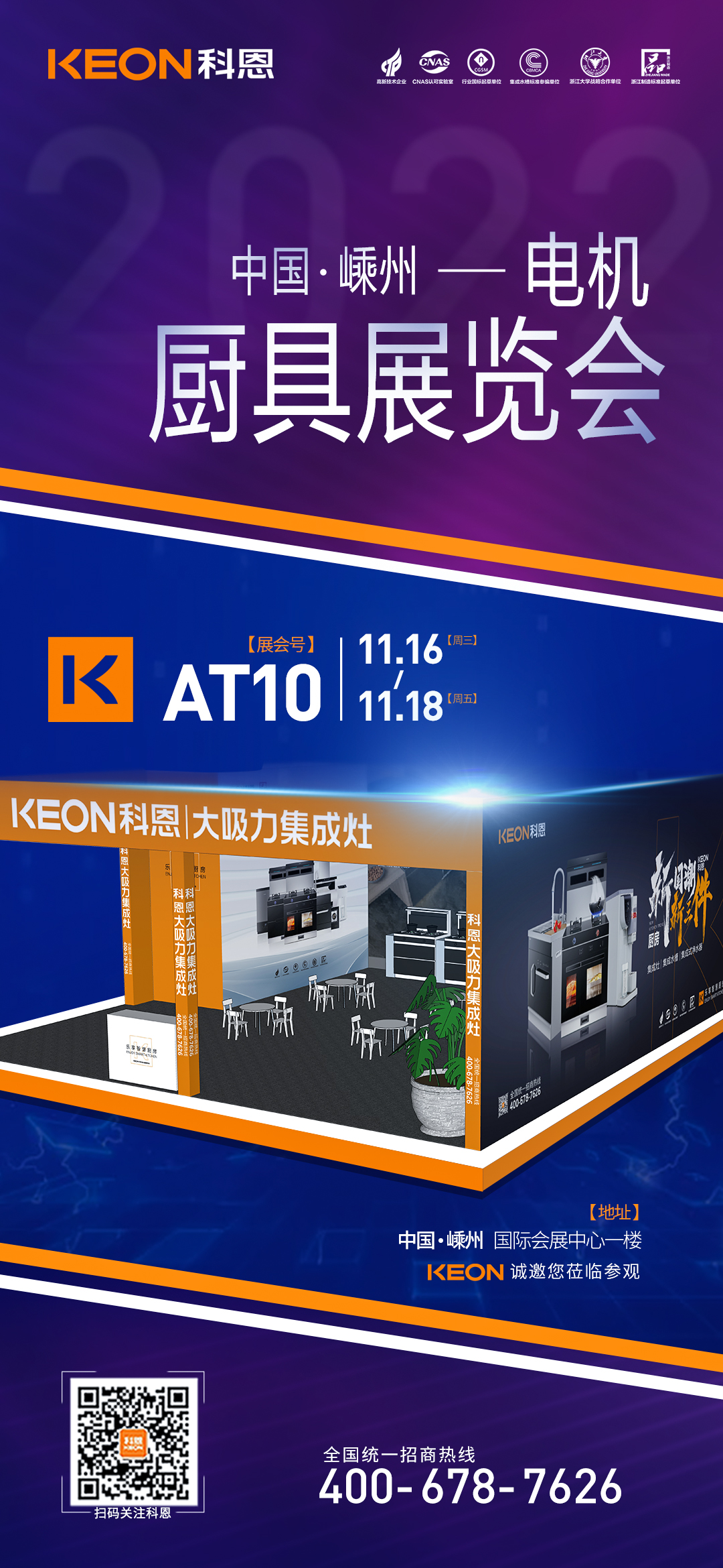2022年11月16日-18日,第十五屆中國(嵊州)電機 ·廚具展覽會將在中國廚具之都——嵊州隆重開幕,科恩集成灶作為廚電行業(yè)領軍品牌受邀參加本次展會(展會號:AT10)
