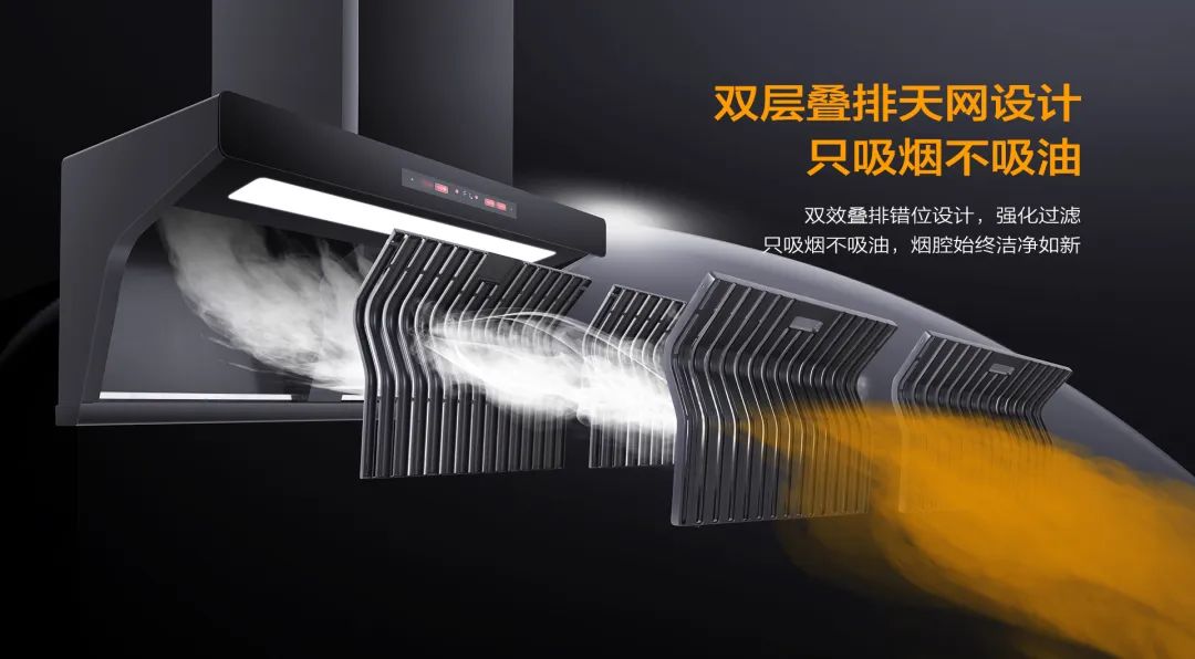 雙效疊排天網搭配6重油煙分離,這樣的煙機才能做到免清洗,更省心!