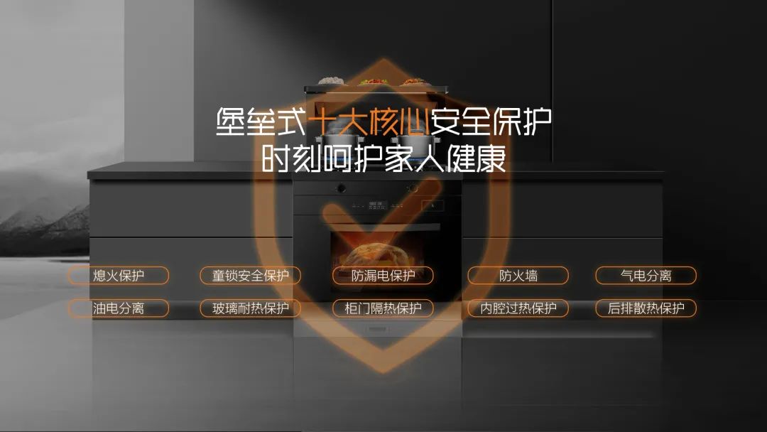 熄火保護、童鎖安全保護、防漏電保護、防火墻、氣電分離、油電分離、玻璃耐熱保護、柜門隔熱保護、內腔過熱保護 、后排散熱保護。十大安全防護,保障烹飪安全!