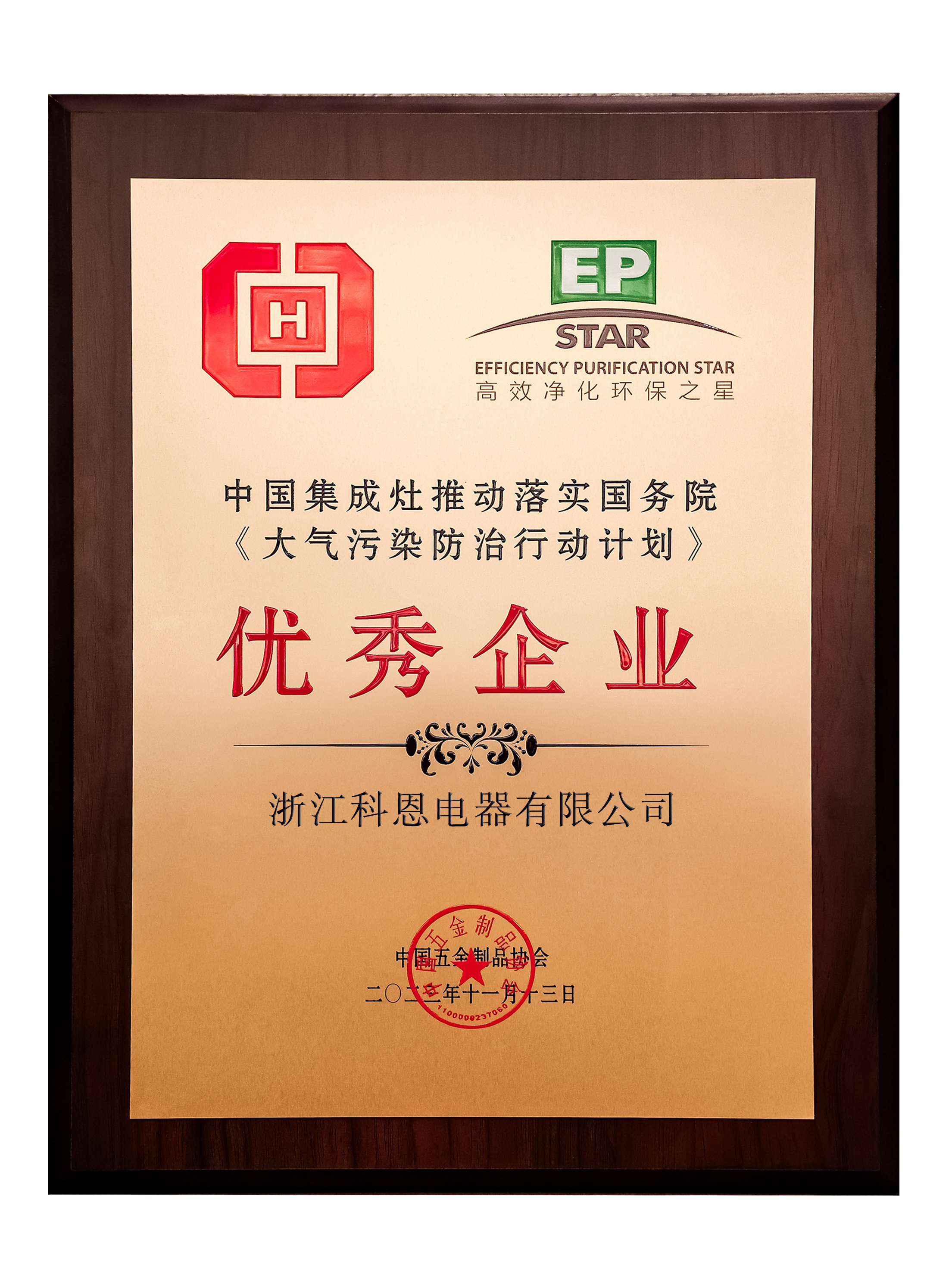 2023年11月28日,主題為“煙火人間 凈秀山河”有中國五金制品協會召開的“中國五金制品協會吸油煙機分會·換屆&技術大會暨‘高效凈化環保之星’10周年慶典”在杭州隆重舉辦。會上發布了獲得本屆“高效凈化環保之星”的優秀企業,并向多年來連續參與此項目并表現突出的企業給予了嘉獎。科恩再一次榮獲“中國五金制品協會-理事單位”及“中國集成灶推動落實國務院《大氣污染防治行動計劃》-優秀企業”!