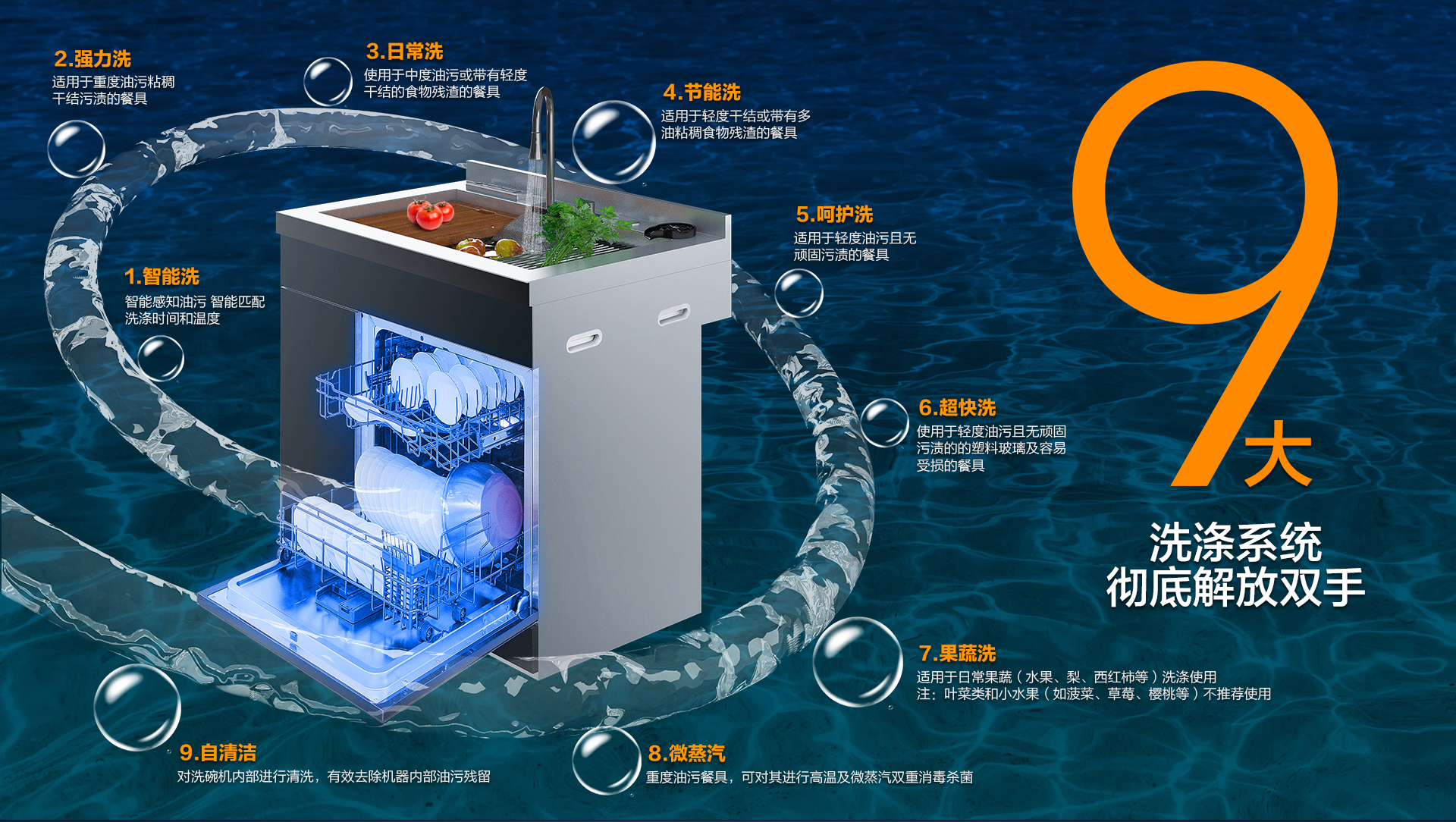 9大洗滌系統,可滿足用戶不同洗滌需求。