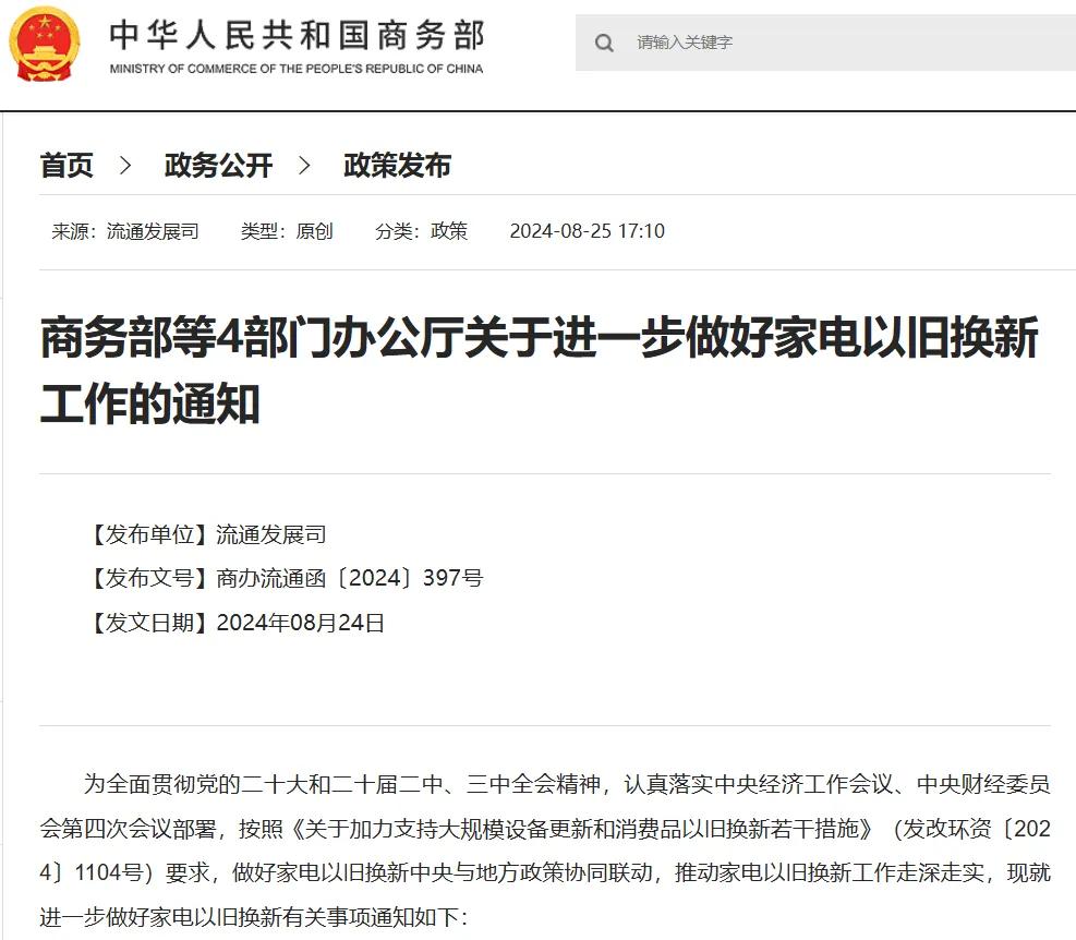 825日,商務部等4部門發布《關于進一步做好家電以舊換新工作的通知》,做好家電以舊換新中央與地方政策協同聯動,明確有關事項。