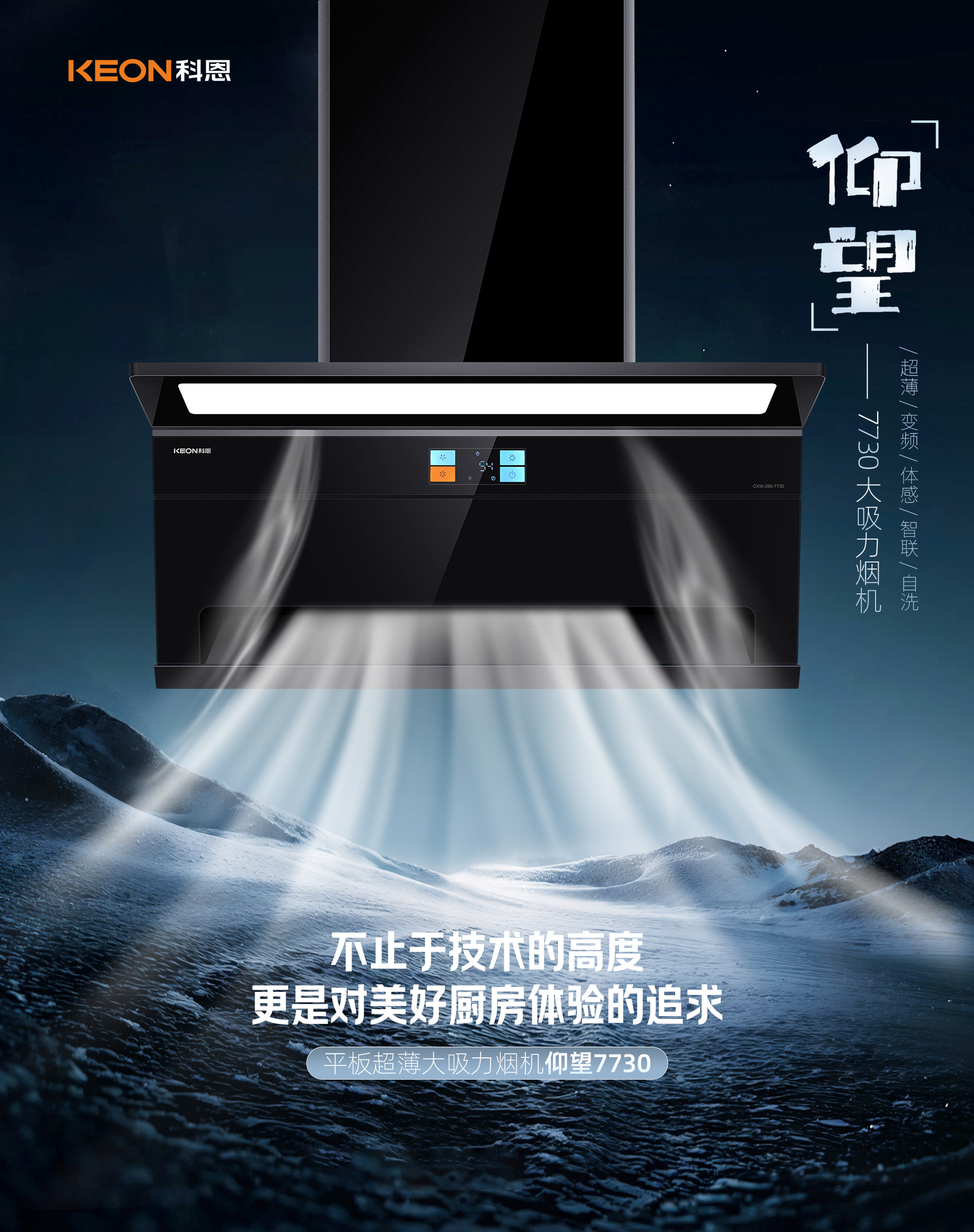 科恩7730智能聯(lián)動煙機整機采用特氟龍工藝,一體成型的設計,不僅使其具備不沾油的卓越特性,更在外觀上顯得格外美觀。這種獨特的工藝處理,讓廚房器具在日常使用與清潔過程中都變得輕松便捷,始終保持著光潔如新的狀態(tài),為廚房增添了一份精致與高雅。其新輕薄的設計重構(gòu)了廚房的空間格局。120°上仰天鵝頸設計堪稱一大亮點,曲頸的巧妙構(gòu)造營造出2.0cm超薄的視覺效果。在精控分寸之間展現(xiàn)出無與倫比的美感,同時釋放出開闊的空間,讓烹飪者能夠在寬敞舒適的環(huán)境中盡情施展廚藝,締造更為舒心愉悅的烹飪體驗。