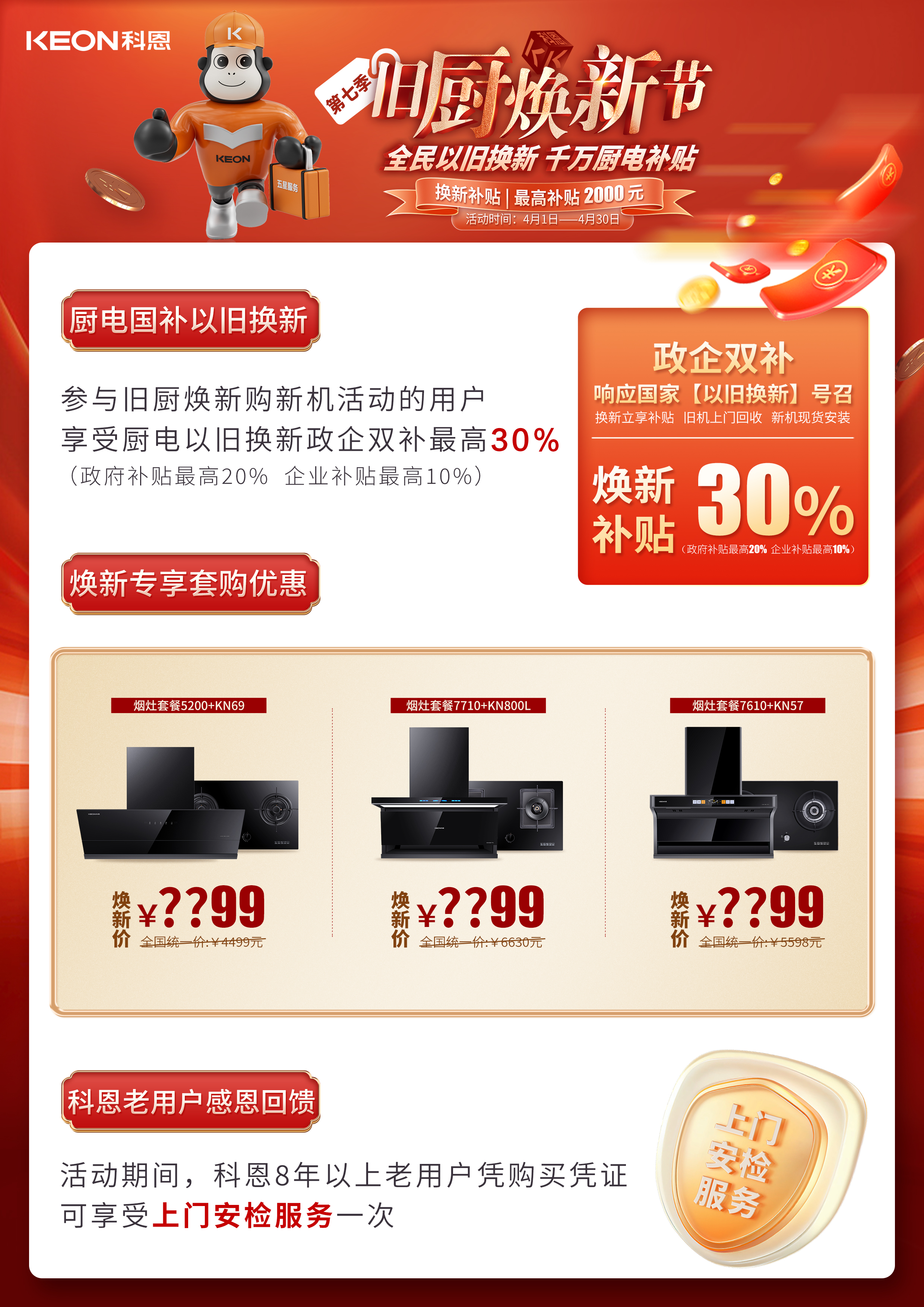 科恩四月舊廚煥新節傾情呈現,全民以舊換新,千萬補貼惠全民!專享套購優惠任你選擇,煙灶套餐5200+KN69,7710+KN800L,7610+KN57,熱門機型驚喜直降。煙機纖薄機身,完美平嵌,輕松換裝,颶風吸力,瞬吸油煙,打造無煙廚房。搭配灶具猛火爆炒更給力,節能高效,享受無憂烹飪!
