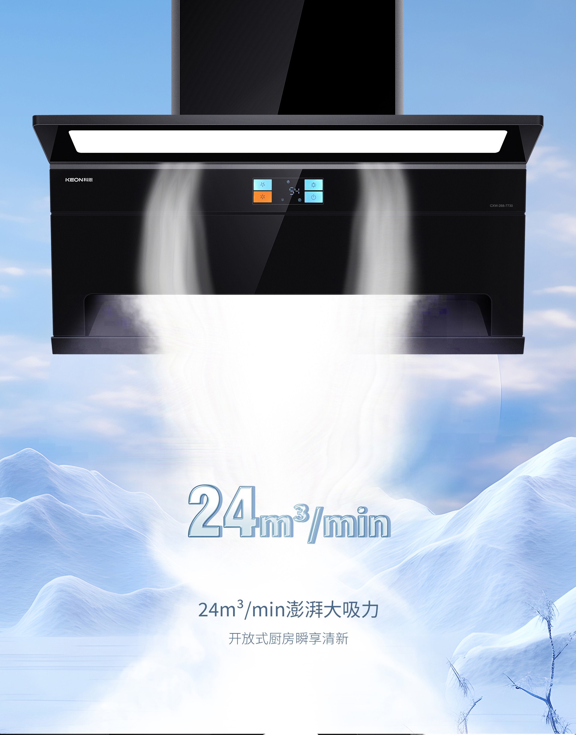 纖薄設計,釋放烹飪空間。老廚房空間局促?換新無需大改。120°上仰天鵝頸設計,勾勒 2.0cm 超薄視覺,0.5立方敞開式大空間,翻炒轉身不碰頭。特氟龍一體成型機身,油污一擦即凈,久用如新,7730定義凈煙新美學。