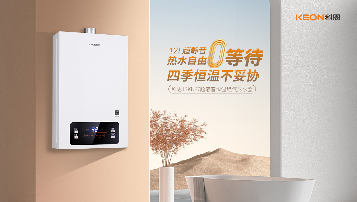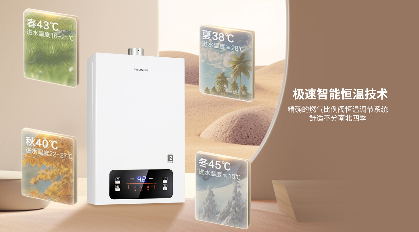 分段燃燒,節能高效無氧銅水箱加持,熱效率高89%寬域調溫,適配全季能傳感控溫,精準無誤科恩12KN67燃氣熱水器,四季適配