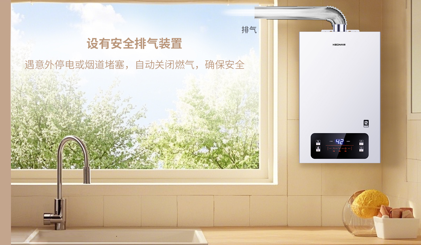 13重防護,安全護航。堡壘式安全設計,隱患清零,停電煙道堵塞自動斷燃,防護升級,12KN67燃氣熱水器,周全守護,定時關機+通風提醒,科恩12KN67燃氣熱水器,安心沐浴。
