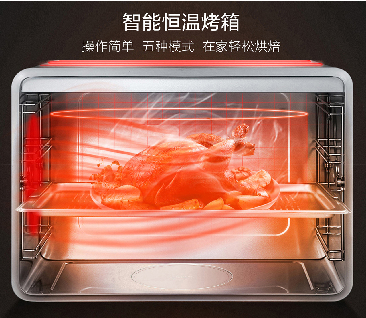 62L大容量食品級304不銹鋼內膽,上下4層設計,9種蒸烤模式。