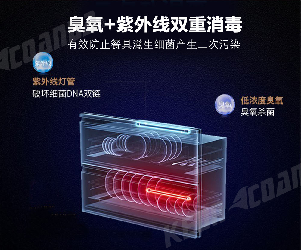 臭氧+紫外線雙重消毒設計,有效防止餐具滋生細菌產生二次污染等風險