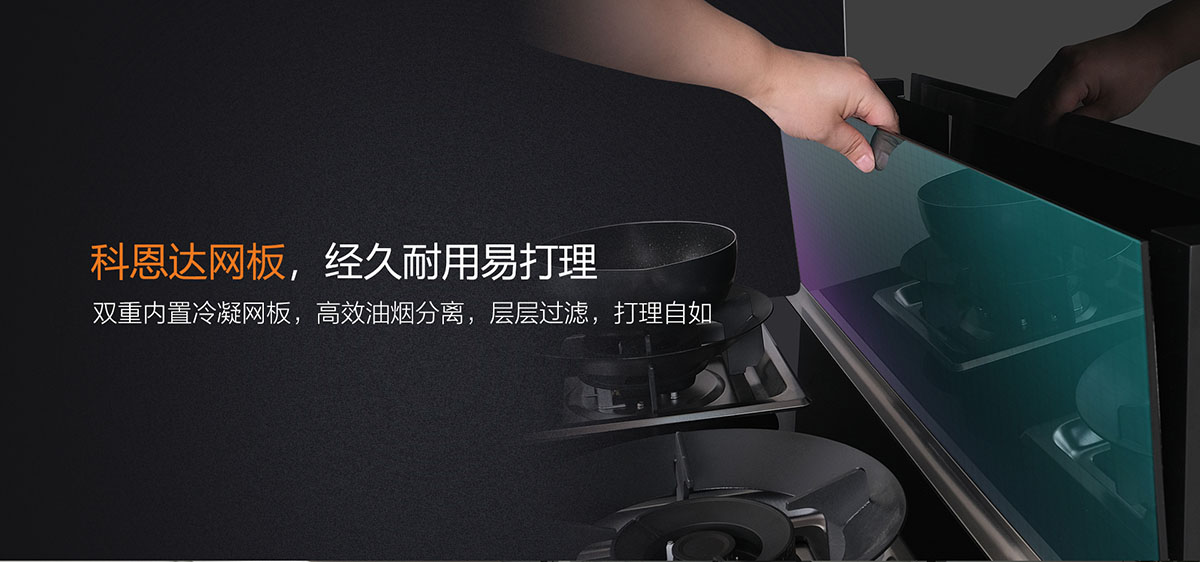 雙重冷凝網(wǎng)板,高效油煙分離,打理方便自如